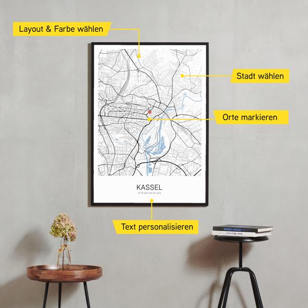 Wähle Farben und Layouts, die perfekt zu dir passen. Ob als klassische Karte in schwarz-weiß oder in modernen Farben. Bei Cartida kannst du ein Design in deinen Lieblingsfarben wählen. Erstelle eine Variante von Kassel, die perfekt zu dir und deiner Wohnung passt.