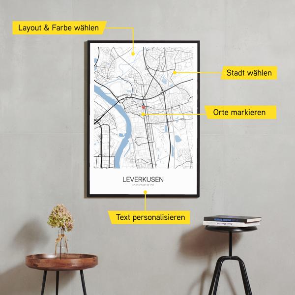 Wähle Farben und Layouts, die perfekt zu dir passen. Ob als klassische Karte in schwarz-weiß oder in modernen Farben. Bei Cartida kannst du ein Design in deinen Lieblingsfarben wählen. Erstelle eine Variante von Leverkusen, die perfekt zu dir und deiner Wohnung passt.