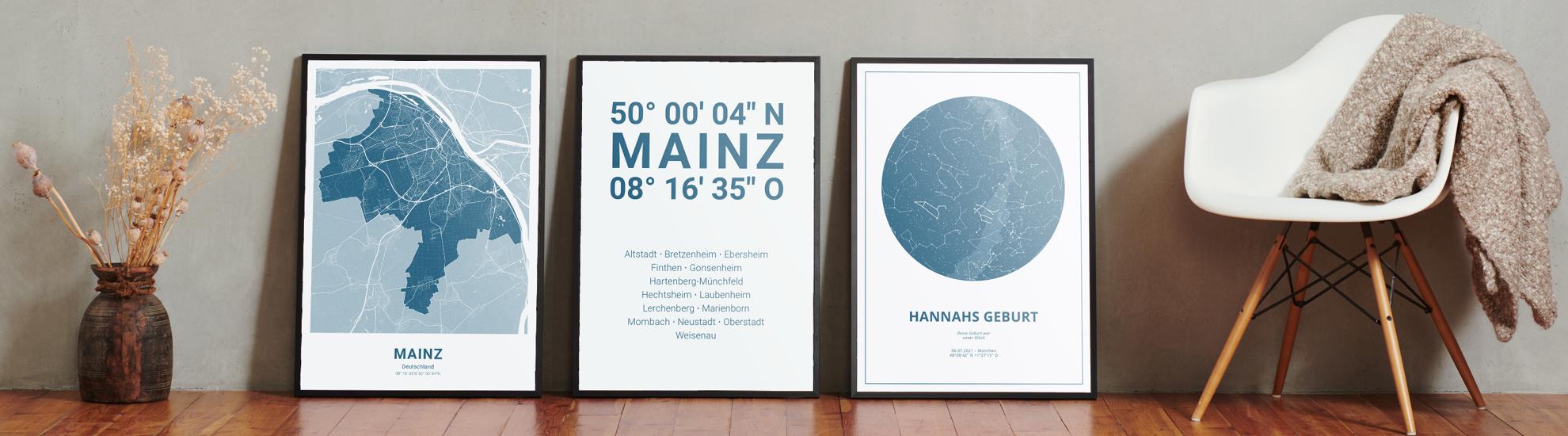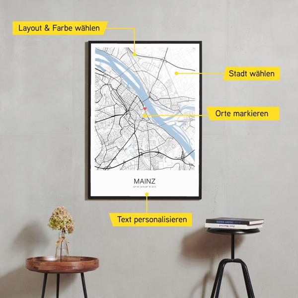 Wähle Farben und Layouts, die perfekt zu dir passen. Ob als klassische Karte in schwarz-weiß oder in modernen Farben. Bei Cartida kannst du ein Design in deinen Lieblingsfarben wählen. Erstelle eine Variante von Mainz, die perfekt zu dir und deiner Wohnung passt.