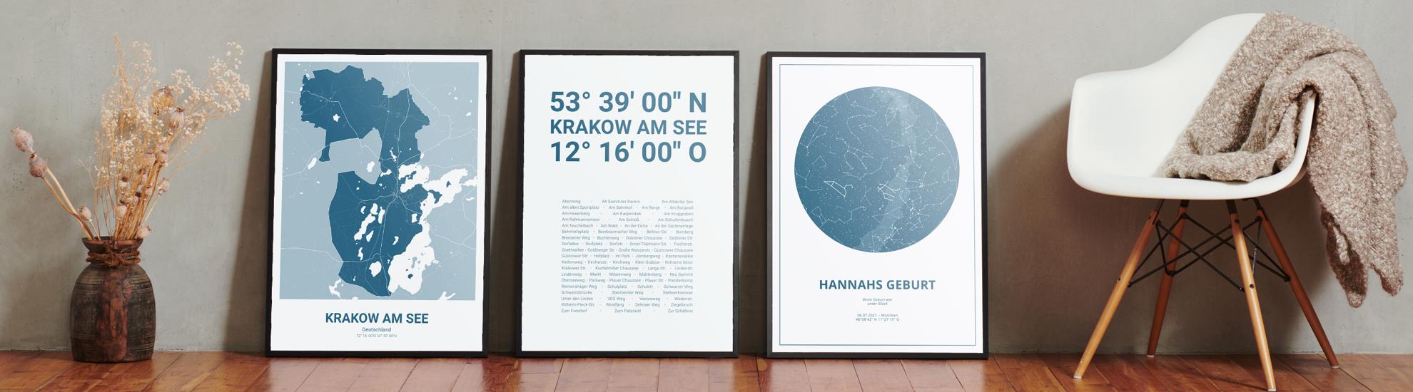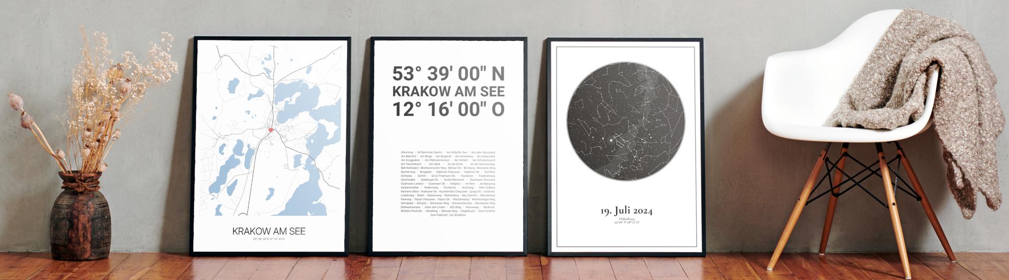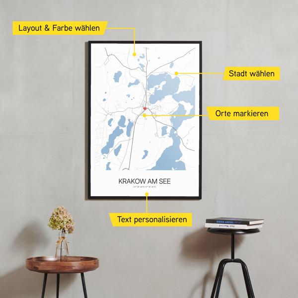Wähle Farben und Layouts, die perfekt zu dir passen. Ob als klassische Karte in schwarz-weiß oder in modernen Farben. Bei Cartida kannst du ein Design in deinen Lieblingsfarben wählen. Erstelle eine Variante von Krakow am See, die perfekt zu dir und deiner Wohnung passt.