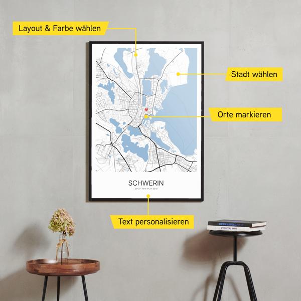 Wähle Farben und Layouts, die perfekt zu dir passen. Ob als klassische Karte in schwarz-weiß oder in modernen Farben. Bei Cartida kannst du ein Design in deinen Lieblingsfarben wählen. Erstelle eine Variante von Schwerin, die perfekt zu dir und deiner Wohnung passt.