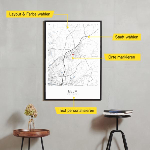 Wähle Farben und Layouts, die perfekt zu dir passen. Ob als klassische Karte in schwarz-weiß oder in modernen Farben. Bei Cartida kannst du ein Design in deinen Lieblingsfarben wählen. Erstelle eine Variante von Belm, die perfekt zu dir und deiner Wohnung passt.