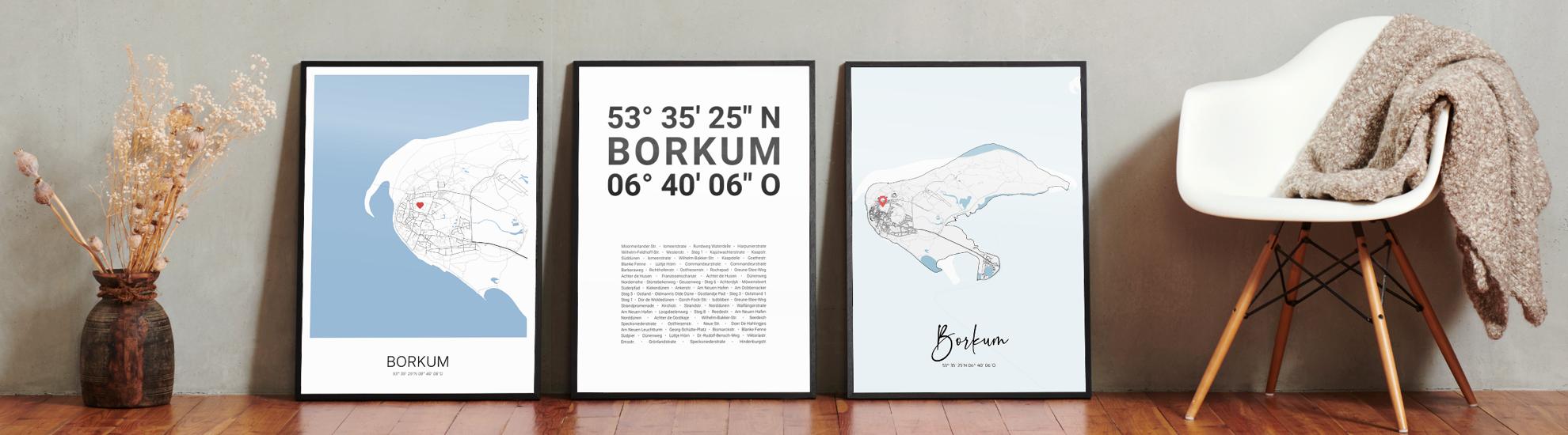 Wähle Farben und Layouts, die perfekt zu dir passen. Ob als klassische Karte in schwarz-weiß oder in modernen Farben. Bei Cartida kannst du ein Design in deinen Lieblingsfarben wählen. Erstelle eine Variante von Borkum, die perfekt zu dir und deiner Wohnung passt.