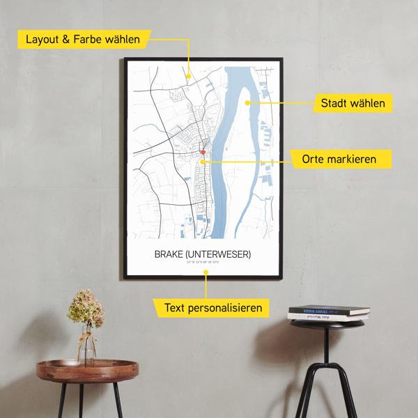 Wähle Farben und Layouts, die perfekt zu dir passen. Ob als klassische Karte in schwarz-weiß oder in modernen Farben. Bei Cartida kannst du ein Design in deinen Lieblingsfarben wählen. Erstelle eine Variante von Brake (Unterweser), die perfekt zu dir und deiner Wohnung passt.