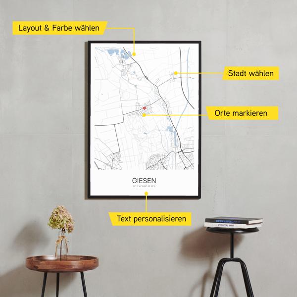 Wähle Farben und Layouts, die perfekt zu dir passen. Ob als klassische Karte in schwarz-weiß oder in modernen Farben. Bei Cartida kannst du ein Design in deinen Lieblingsfarben wählen. Erstelle eine Variante von Giesen, die perfekt zu dir und deiner Wohnung passt.