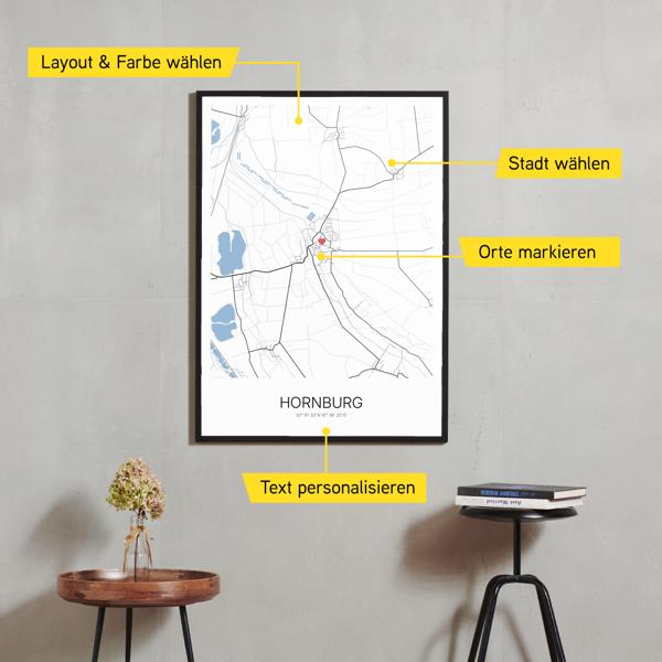 Wähle Farben und Layouts, die perfekt zu dir passen. Ob als klassische Karte in schwarz-weiß oder in modernen Farben. Bei Cartida kannst du ein Design in deinen Lieblingsfarben wählen. Erstelle eine Variante von Hornburg, die perfekt zu dir und deiner Wohnung passt.