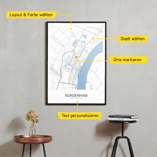 Wähle Farben und Layouts, die perfekt zu dir passen. Ob als klassische Karte in schwarz-weiß oder in modernen Farben. Bei Cartida kannst du ein Design in deinen Lieblingsfarben wählen. Erstelle eine Variante von Nordenham, die perfekt zu dir und deiner Wohnung passt.