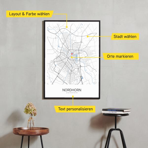 Wähle Farben und Layouts, die perfekt zu dir passen. Ob als klassische Karte in schwarz-weiß oder in modernen Farben. Bei Cartida kannst du ein Design in deinen Lieblingsfarben wählen. Erstelle eine Variante von Nordhorn, die perfekt zu dir und deiner Wohnung passt.