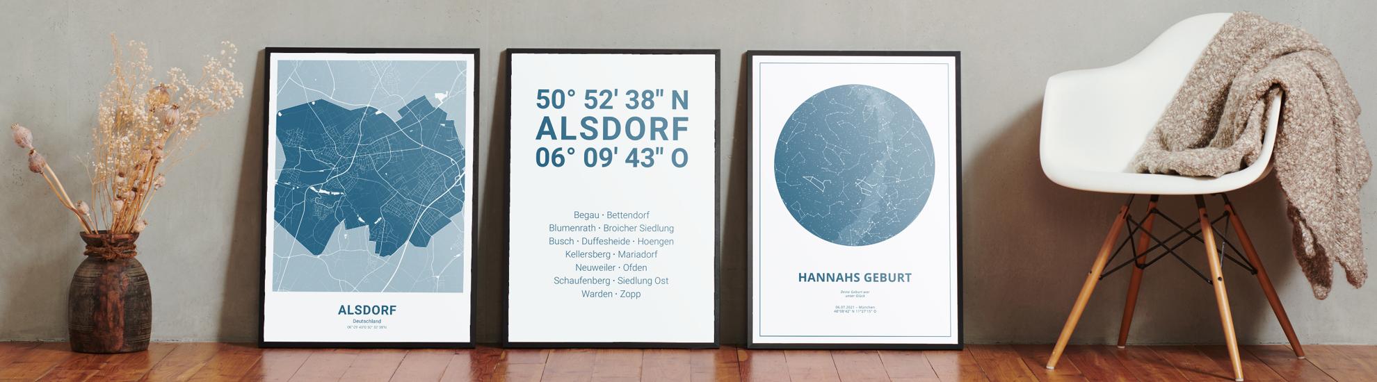 Wähle Farben und Layouts, die perfekt zu dir passen. Ob als klassische Karte in schwarz-weiß oder in modernen Farben. Bei Cartida kannst du ein Design in deinen Lieblingsfarben wählen. Erstelle eine Variante von Alsdorf, die perfekt zu dir und deiner Wohnung passt.