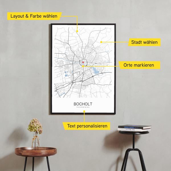 Wähle Farben und Layouts, die perfekt zu dir passen. Ob als klassische Karte in schwarz-weiß oder in modernen Farben. Bei Cartida kannst du ein Design in deinen Lieblingsfarben wählen. Erstelle eine Variante von Bocholt, die perfekt zu dir und deiner Wohnung passt.