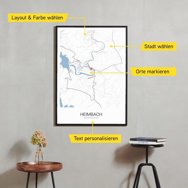 Wähle Farben und Layouts, die perfekt zu dir passen. Ob als klassische Karte in schwarz-weiß oder in modernen Farben. Bei Cartida kannst du ein Design in deinen Lieblingsfarben wählen. Erstelle eine Variante von Heimbach, die perfekt zu dir und deiner Wohnung passt.
