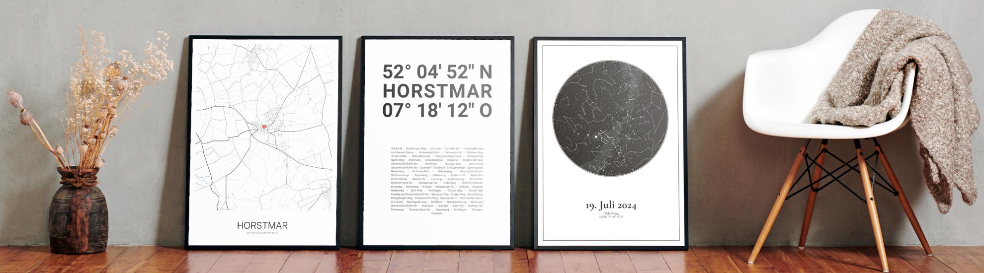 Wähle Farben und Layouts, die perfekt zu dir passen. Ob als klassische Karte in schwarz-weiß oder in modernen Farben. Bei Cartida kannst du ein Design in deinen Lieblingsfarben wählen. Erstelle eine Variante von Horstmar, die perfekt zu dir und deiner Wohnung passt.