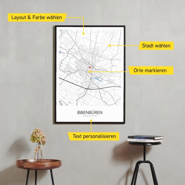 Wähle Farben und Layouts, die perfekt zu dir passen. Ob als klassische Karte in schwarz-weiß oder in modernen Farben. Bei Cartida kannst du ein Design in deinen Lieblingsfarben wählen. Erstelle eine Variante von Ibbenbüren, die perfekt zu dir und deiner Wohnung passt.