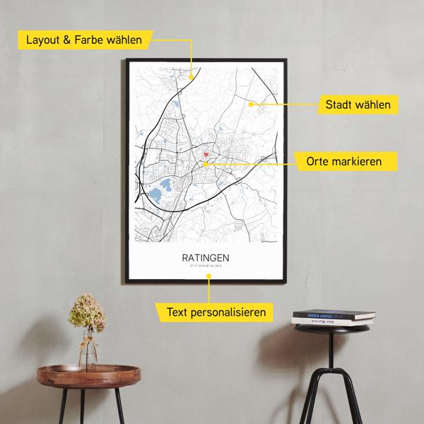 Wähle Farben und Layouts, die perfekt zu dir passen. Ob als klassische Karte in schwarz-weiß oder in modernen Farben. Bei Cartida kannst du ein Design in deinen Lieblingsfarben wählen. Erstelle eine Variante von Ratingen, die perfekt zu dir und deiner Wohnung passt.