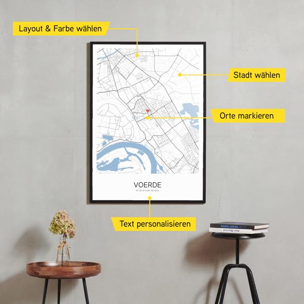 Wähle Farben und Layouts, die perfekt zu dir passen. Ob als klassische Karte in schwarz-weiß oder in modernen Farben. Bei Cartida kannst du ein Design in deinen Lieblingsfarben wählen. Erstelle eine Variante von Voerde, die perfekt zu dir und deiner Wohnung passt.