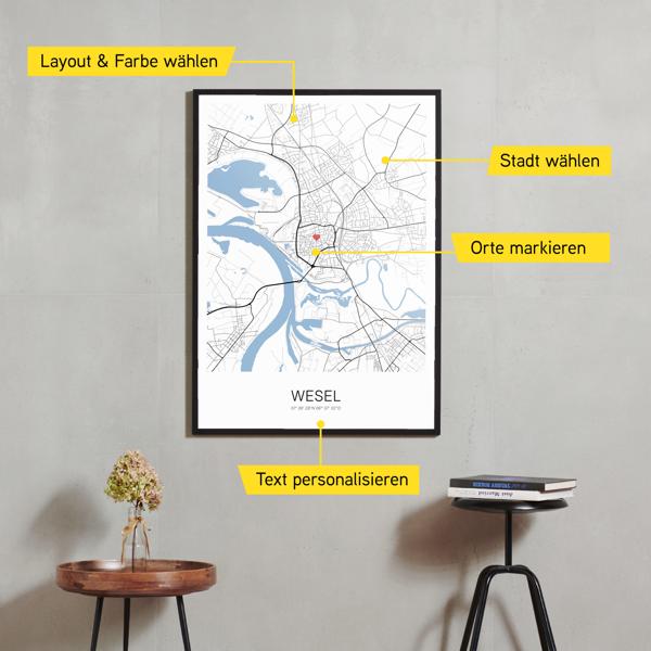 Wähle Farben und Layouts, die perfekt zu dir passen. Ob als klassische Karte in schwarz-weiß oder in modernen Farben. Bei Cartida kannst du ein Design in deinen Lieblingsfarben wählen. Erstelle eine Variante von Wesel, die perfekt zu dir und deiner Wohnung passt.