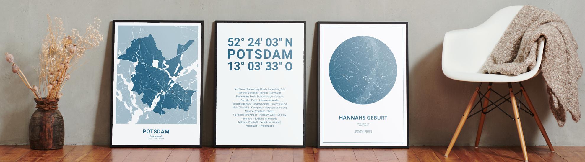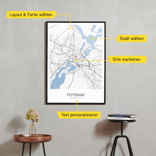 Wähle Farben und Layouts, die perfekt zu dir passen. Ob als klassische Karte in schwarz-weiß oder in modernen Farben. Bei Cartida kannst du ein Design in deinen Lieblingsfarben wählen. Erstelle eine Variante von Potsdam, die perfekt zu dir und deiner Wohnung passt.