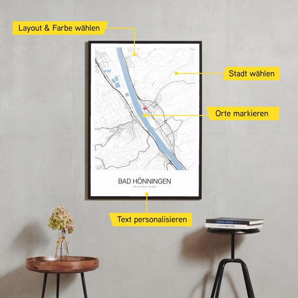 Wähle Farben und Layouts, die perfekt zu dir passen. Ob als klassische Karte in schwarz-weiß oder in modernen Farben. Bei Cartida kannst du ein Design in deinen Lieblingsfarben wählen. Erstelle eine Variante von Bad Hönningen, die perfekt zu dir und deiner Wohnung passt.