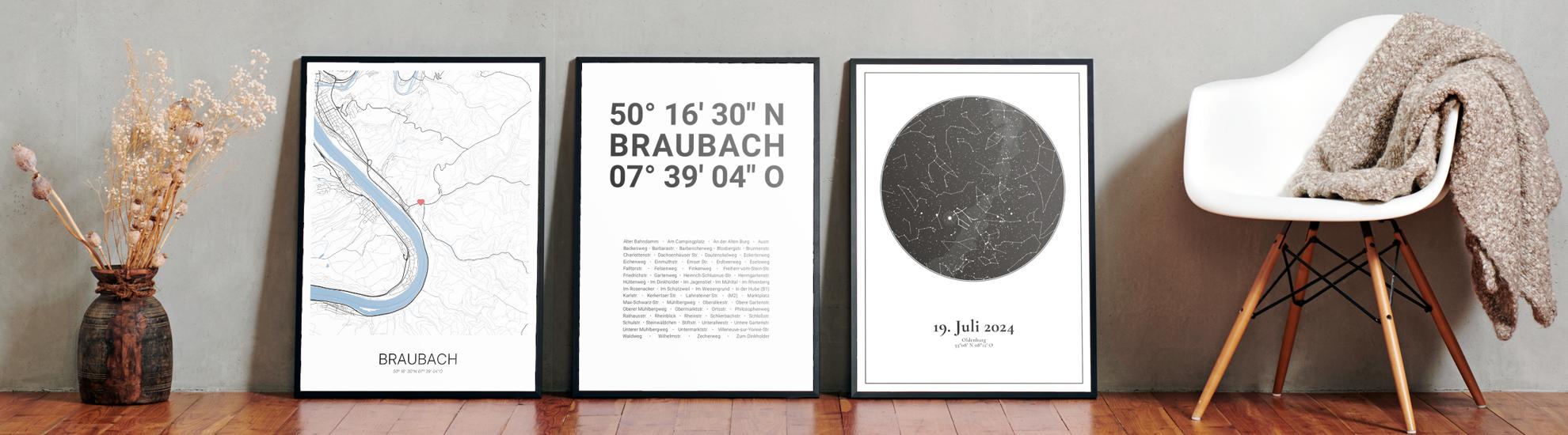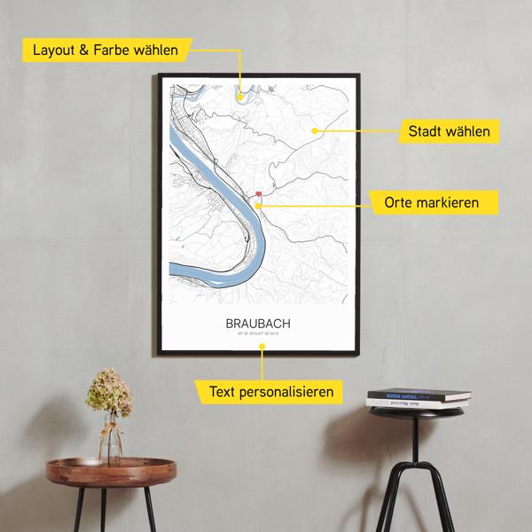 Wähle Farben und Layouts, die perfekt zu dir passen. Ob als klassische Karte in schwarz-weiß oder in modernen Farben. Bei Cartida kannst du ein Design in deinen Lieblingsfarben wählen. Erstelle eine Variante von Braubach, die perfekt zu dir und deiner Wohnung passt.