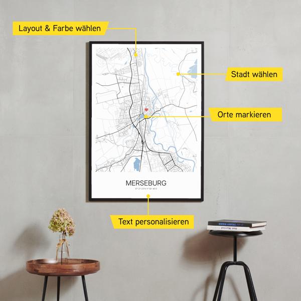 Wähle Farben und Layouts, die perfekt zu dir passen. Ob als klassische Karte in schwarz-weiß oder in modernen Farben. Bei Cartida kannst du ein Design in deinen Lieblingsfarben wählen. Erstelle eine Variante von Merseburg, die perfekt zu dir und deiner Wohnung passt.