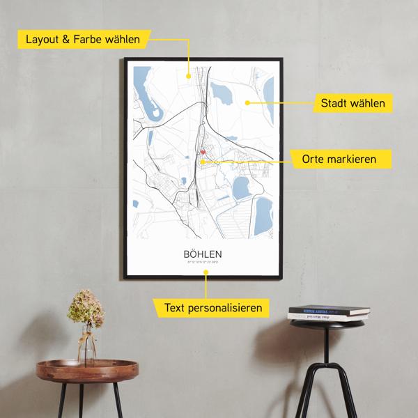 Wähle Farben und Layouts, die perfekt zu dir passen. Ob als klassische Karte in schwarz-weiß oder in modernen Farben. Bei Cartida kannst du ein Design in deinen Lieblingsfarben wählen. Erstelle eine Variante von Böhlen, die perfekt zu dir und deiner Wohnung passt.