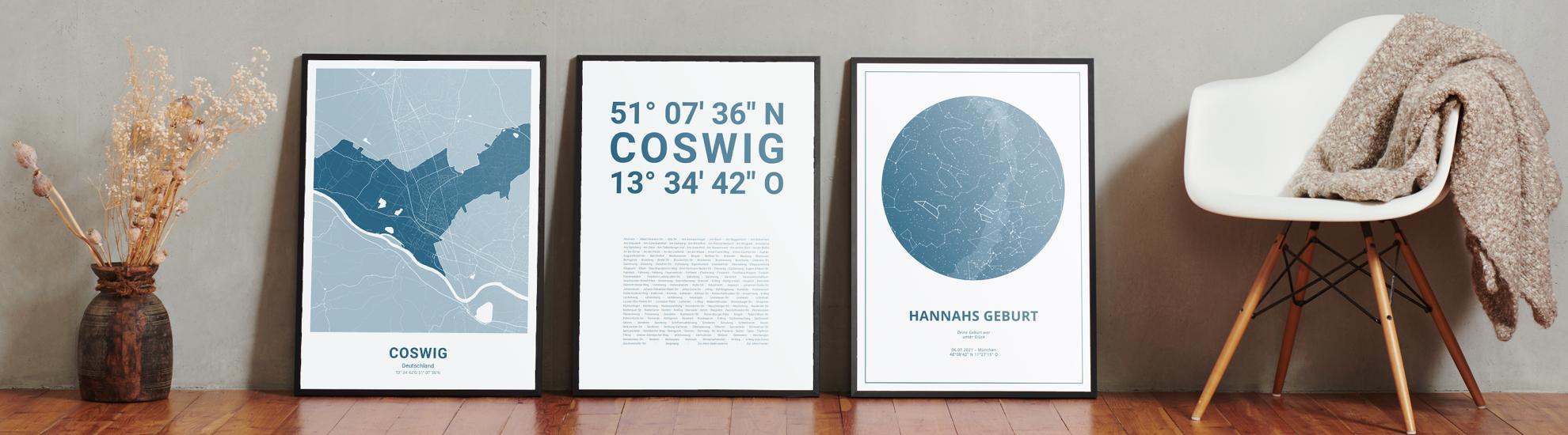 Wähle Farben und Layouts, die perfekt zu dir passen. Ob als klassische Karte in schwarz-weiß oder in modernen Farben. Bei Cartida kannst du ein Design in deinen Lieblingsfarben wählen. Erstelle eine Variante von Coswig, die perfekt zu dir und deiner Wohnung passt.