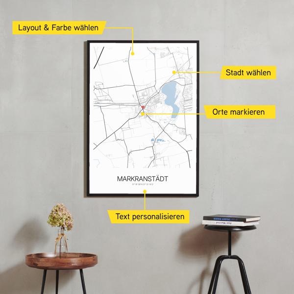 Wähle Farben und Layouts, die perfekt zu dir passen. Ob als klassische Karte in schwarz-weiß oder in modernen Farben. Bei Cartida kannst du ein Design in deinen Lieblingsfarben wählen. Erstelle eine Variante von Markranstädt, die perfekt zu dir und deiner Wohnung passt.