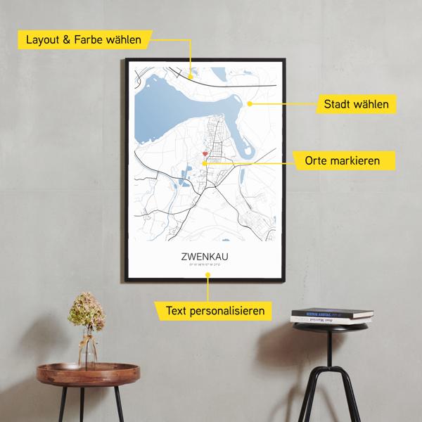 Wähle Farben und Layouts, die perfekt zu dir passen. Ob als klassische Karte in schwarz-weiß oder in modernen Farben. Bei Cartida kannst du ein Design in deinen Lieblingsfarben wählen. Erstelle eine Variante von Zwenkau, die perfekt zu dir und deiner Wohnung passt.