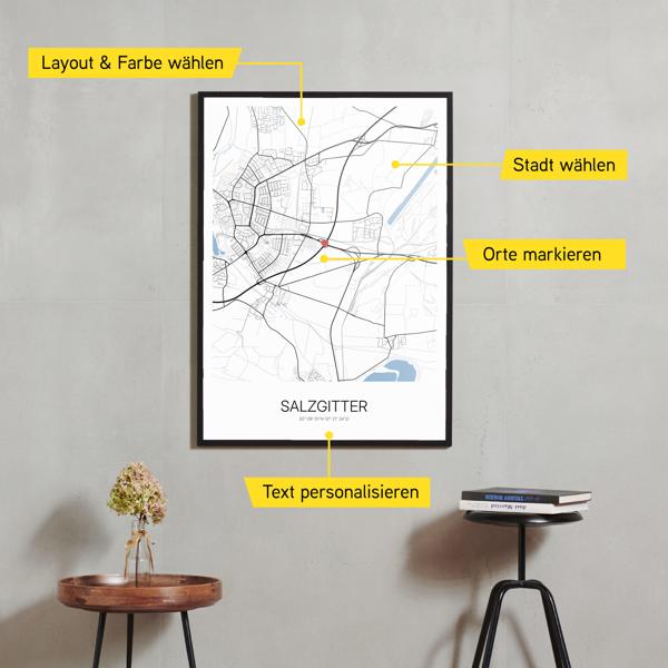Wähle Farben und Layouts, die perfekt zu dir passen. Ob als klassische Karte in schwarz-weiß oder in modernen Farben. Bei Cartida kannst du ein Design in deinen Lieblingsfarben wählen. Erstelle eine Variante von Salzgitter, die perfekt zu dir und deiner Wohnung passt.