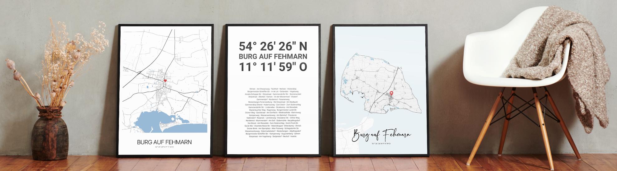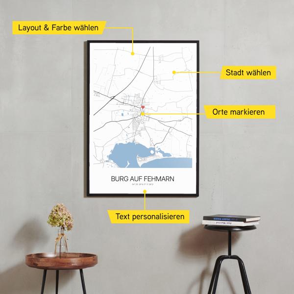 Wähle Farben und Layouts, die perfekt zu dir passen. Ob als klassische Karte in schwarz-weiß oder in modernen Farben. Bei Cartida kannst du ein Design in deinen Lieblingsfarben wählen. Erstelle eine Variante von Burg auf Fehmarn, die perfekt zu dir und deiner Wohnung passt.