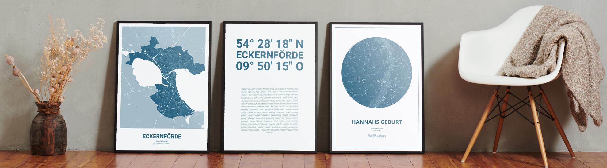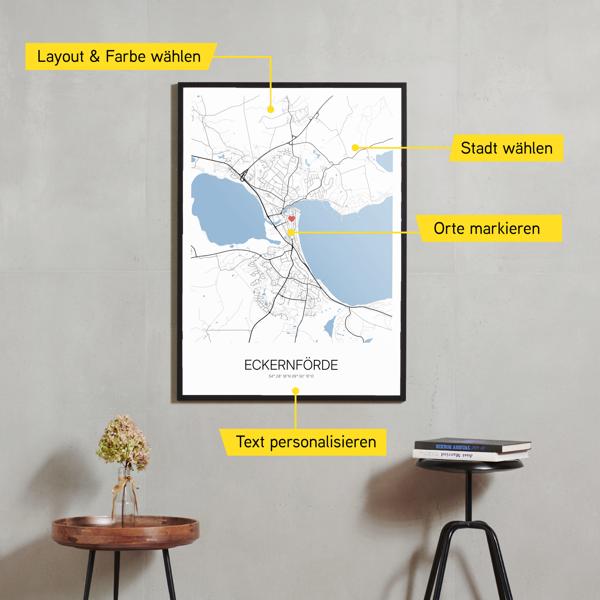 Wähle Farben und Layouts, die perfekt zu dir passen. Ob als klassische Karte in schwarz-weiß oder in modernen Farben. Bei Cartida kannst du ein Design in deinen Lieblingsfarben wählen. Erstelle eine Variante von Eckernförde, die perfekt zu dir und deiner Wohnung passt.