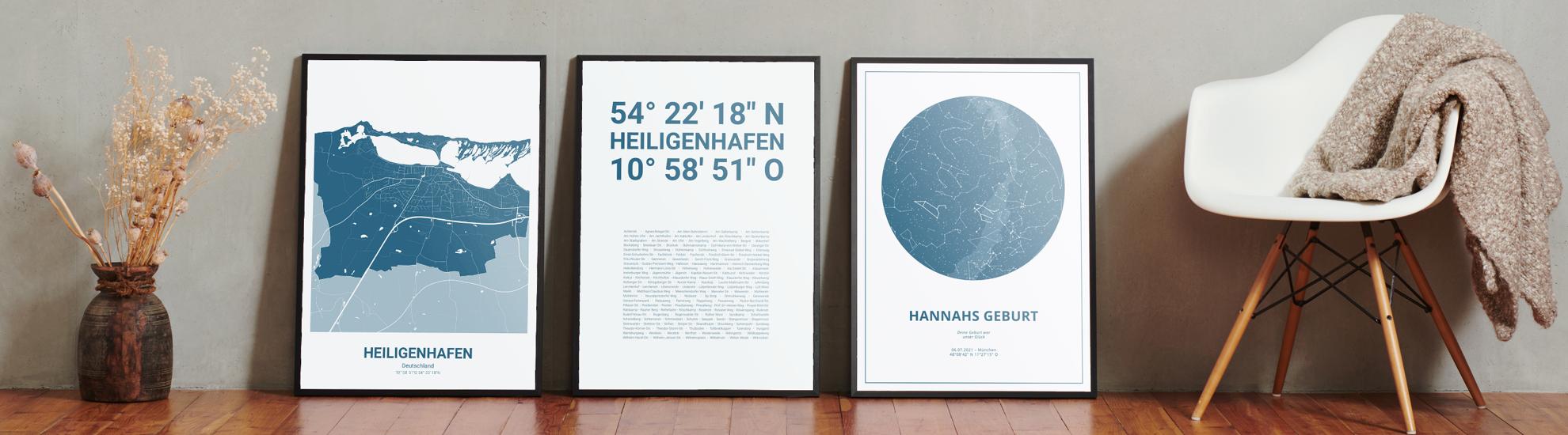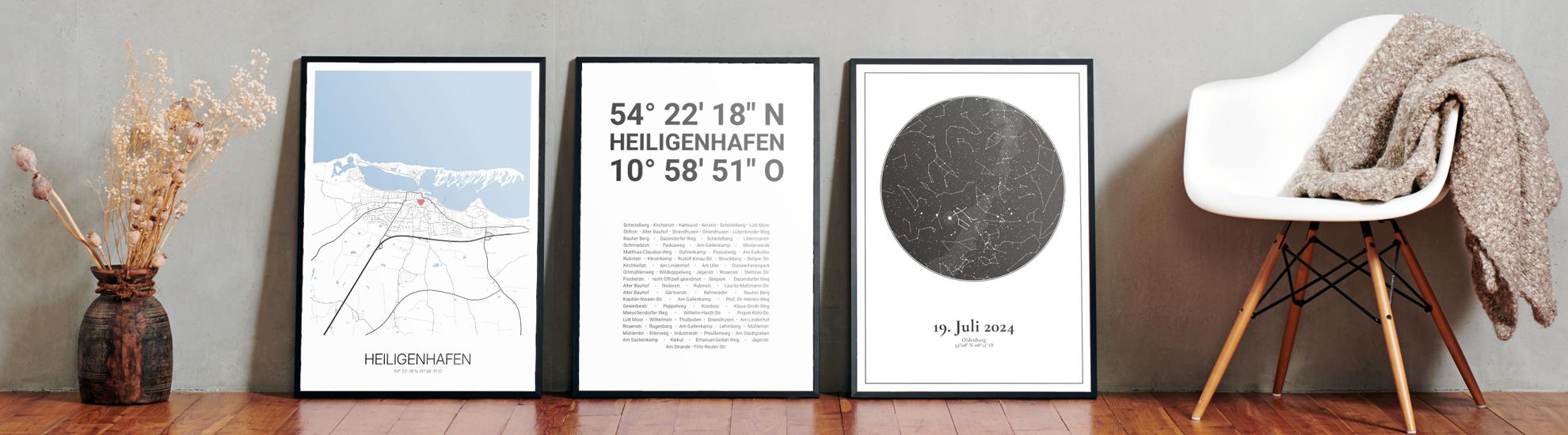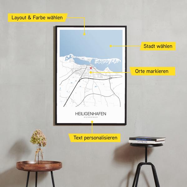 Wähle Farben und Layouts, die perfekt zu dir passen. Ob als klassische Karte in schwarz-weiß oder in modernen Farben. Bei Cartida kannst du ein Design in deinen Lieblingsfarben wählen. Erstelle eine Variante von Heiligenhafen, die perfekt zu dir und deiner Wohnung passt.
