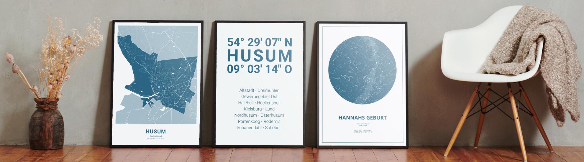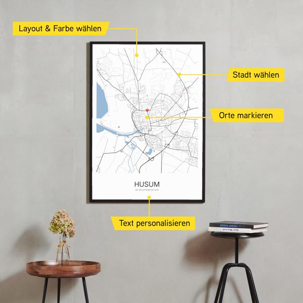 Wähle Farben und Layouts, die perfekt zu dir passen. Ob als klassische Karte in schwarz-weiß oder in modernen Farben. Bei Cartida kannst du ein Design in deinen Lieblingsfarben wählen. Erstelle eine Variante von Husum, die perfekt zu dir und deiner Wohnung passt.
