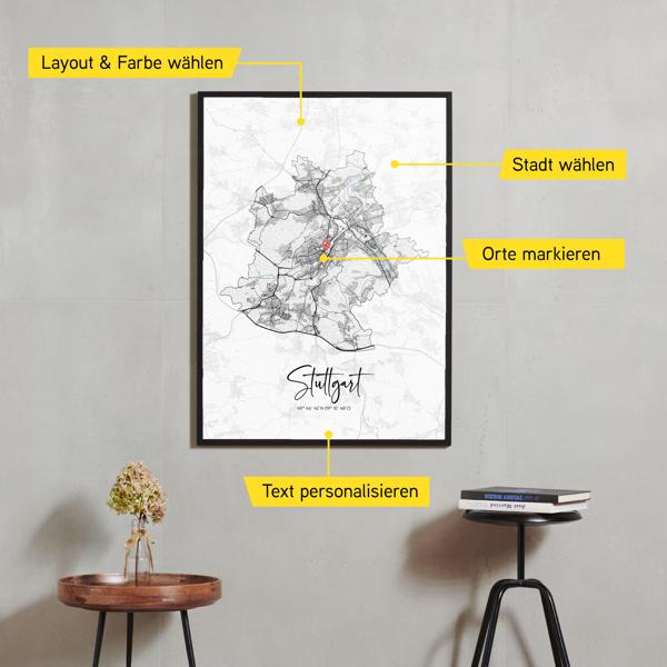 Wähle Farben und Layouts, die perfekt zu dir passen. Ob als klassische Karte in schwarz-weiß oder in modernen Farben. Bei Cartida kannst du ein Design in deinen Lieblingsfarben wählen. Erstelle eine Variante von Stuttgart, die perfekt zu dir und deiner Wohnung passt.