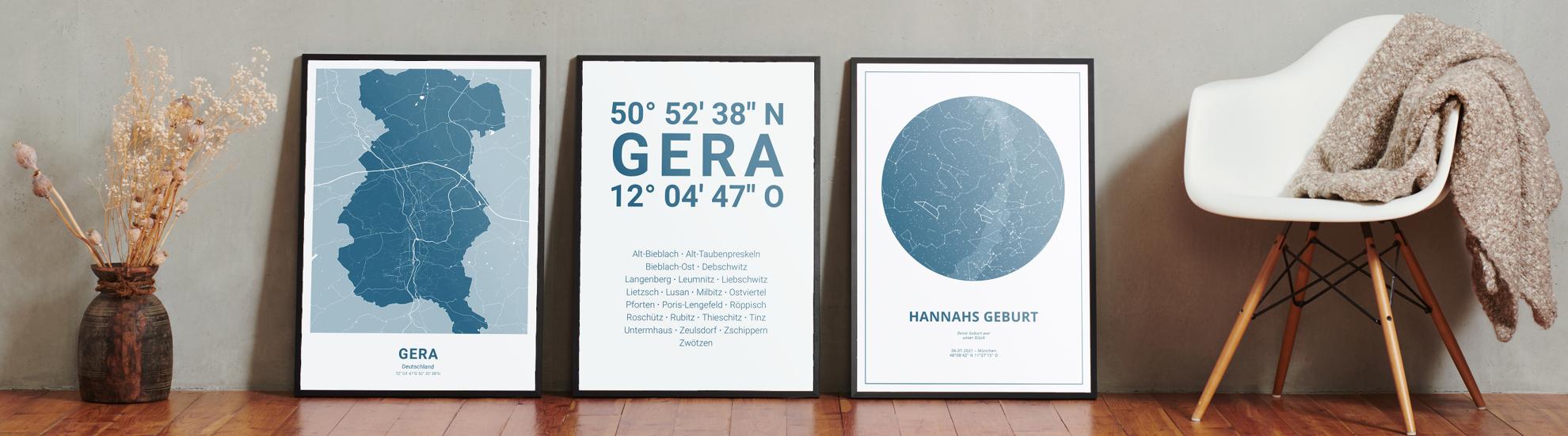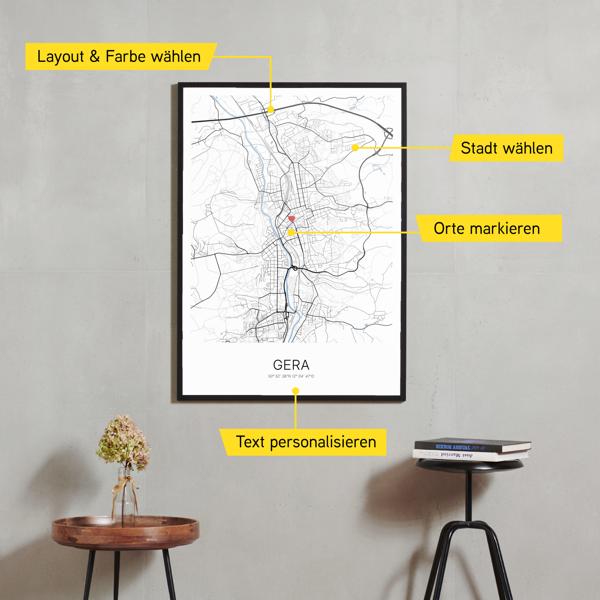 Wähle Farben und Layouts, die perfekt zu dir passen. Ob als klassische Karte in schwarz-weiß oder in modernen Farben. Bei Cartida kannst du ein Design in deinen Lieblingsfarben wählen. Erstelle eine Variante von Gera, die perfekt zu dir und deiner Wohnung passt.