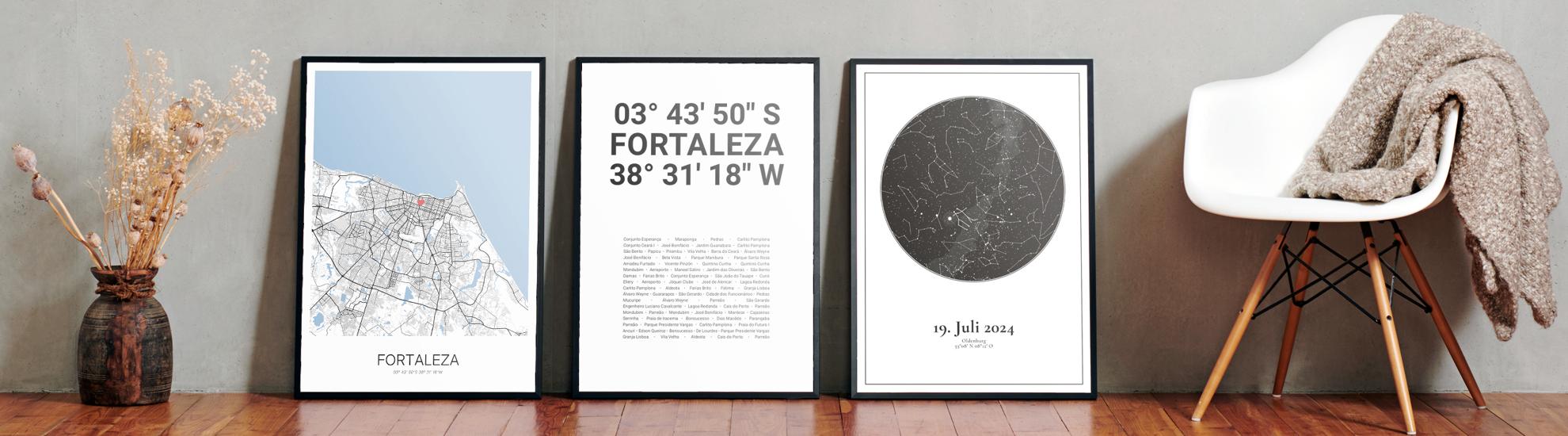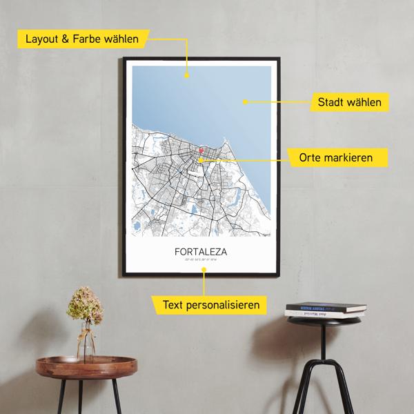 Wähle Farben und Layouts, die perfekt zu dir passen. Ob als klassische Karte in schwarz-weiß oder in modernen Farben. Bei Cartida kannst du ein Design in deinen Lieblingsfarben wählen. Erstelle eine Variante von Fortaleza, die perfekt zu dir und deiner Wohnung passt.