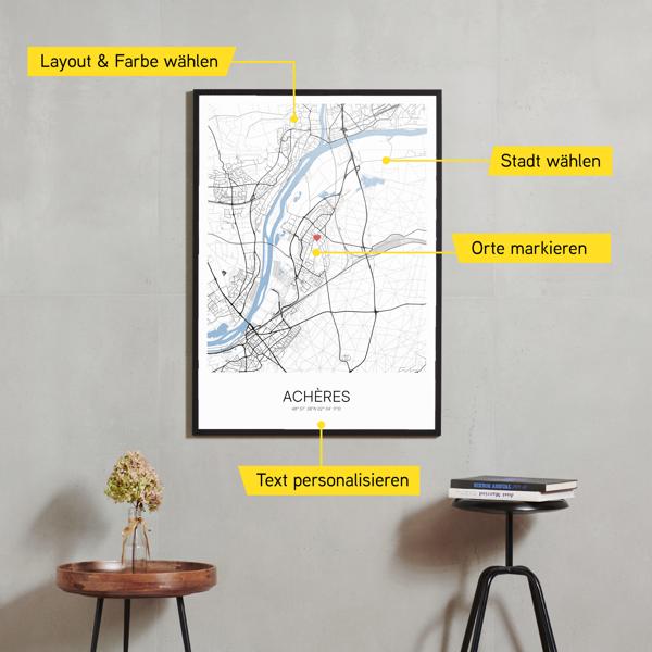 Wähle Farben und Layouts, die perfekt zu dir passen. Ob als klassische Karte in schwarz-weiß oder in modernen Farben. Bei Cartida kannst du ein Design in deinen Lieblingsfarben wählen. Erstelle eine Variante von Achères, die perfekt zu dir und deiner Wohnung passt.