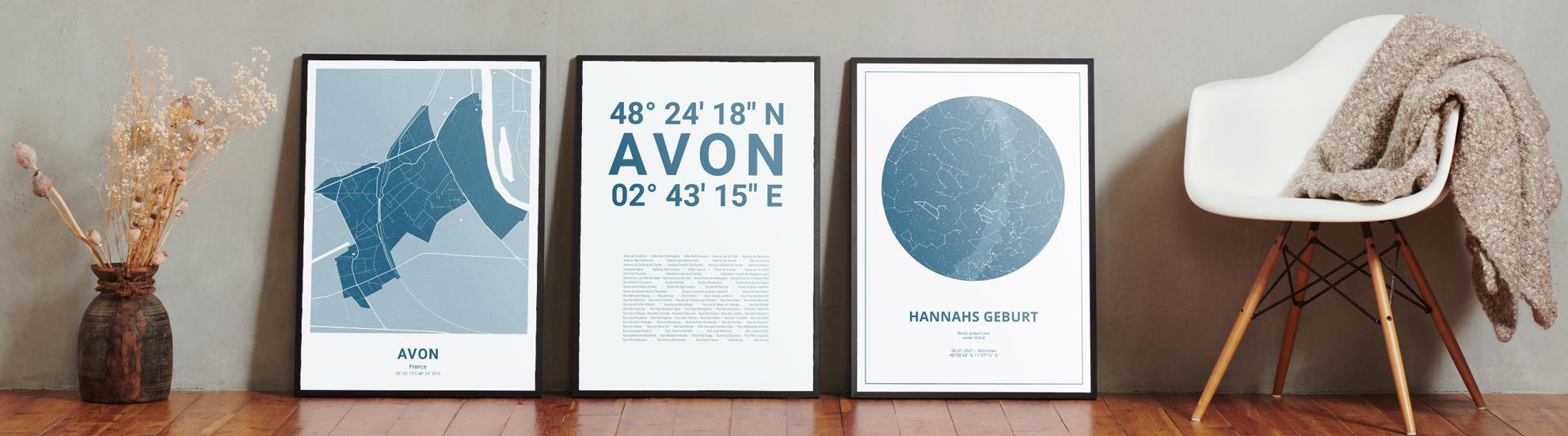 Wähle Farben und Layouts, die perfekt zu dir passen. Ob als klassische Karte in schwarz-weiß oder in modernen Farben. Bei Cartida kannst du ein Design in deinen Lieblingsfarben wählen. Erstelle eine Variante von Avon, die perfekt zu dir und deiner Wohnung passt.