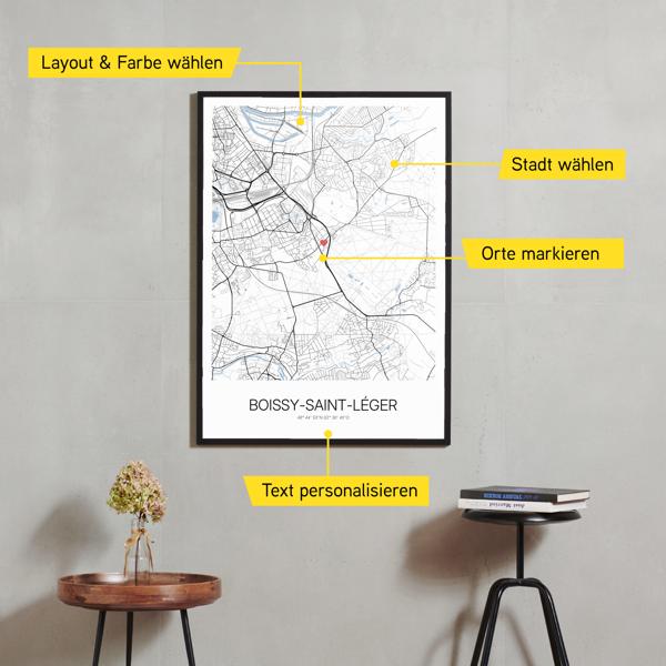 Wähle Farben und Layouts, die perfekt zu dir passen. Ob als klassische Karte in schwarz-weiß oder in modernen Farben. Bei Cartida kannst du ein Design in deinen Lieblingsfarben wählen. Erstelle eine Variante von Boissy-Saint-Léger, die perfekt zu dir und deiner Wohnung passt.