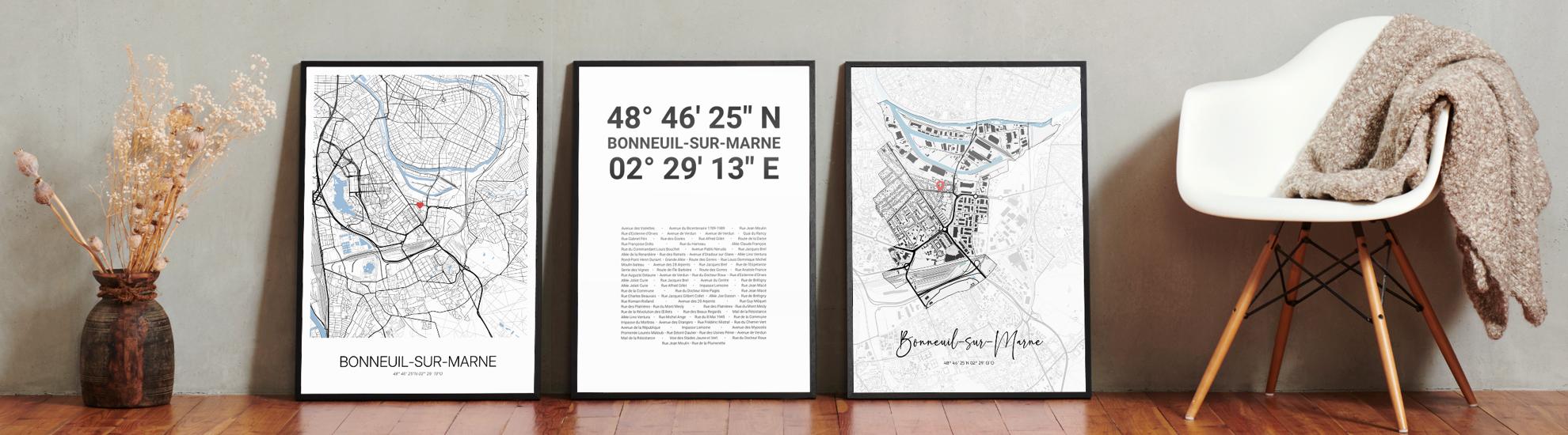 Wähle Farben und Layouts, die perfekt zu dir passen. Ob als klassische Karte in schwarz-weiß oder in modernen Farben. Bei Cartida kannst du ein Design in deinen Lieblingsfarben wählen. Erstelle eine Variante von Bonneuil-sur-Marne, die perfekt zu dir und deiner Wohnung passt.