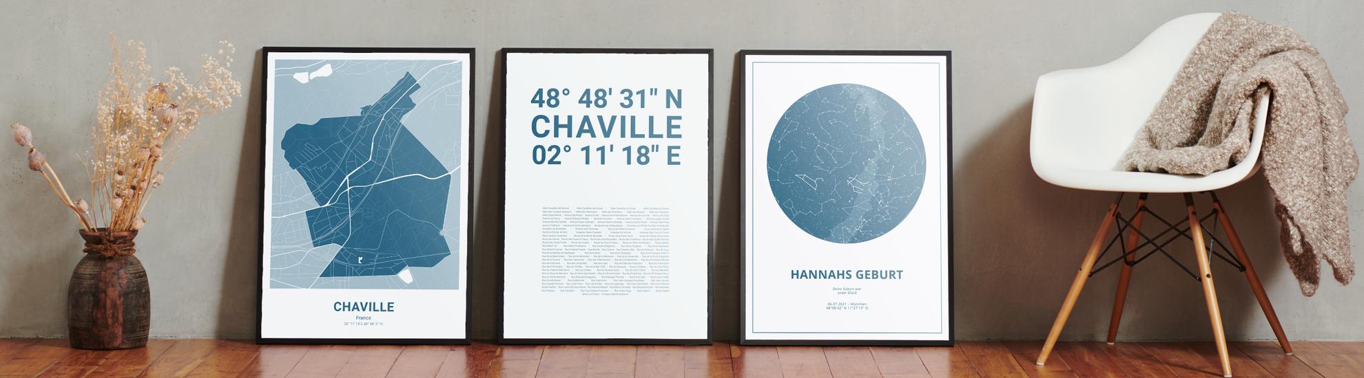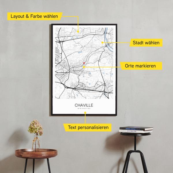 Wähle Farben und Layouts, die perfekt zu dir passen. Ob als klassische Karte in schwarz-weiß oder in modernen Farben. Bei Cartida kannst du ein Design in deinen Lieblingsfarben wählen. Erstelle eine Variante von Chaville, die perfekt zu dir und deiner Wohnung passt.