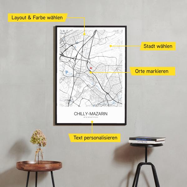 Wähle Farben und Layouts, die perfekt zu dir passen. Ob als klassische Karte in schwarz-weiß oder in modernen Farben. Bei Cartida kannst du ein Design in deinen Lieblingsfarben wählen. Erstelle eine Variante von Chilly-Mazarin, die perfekt zu dir und deiner Wohnung passt.