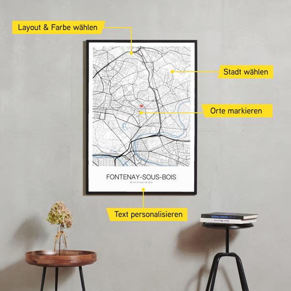 Wähle Farben und Layouts, die perfekt zu dir passen. Ob als klassische Karte in schwarz-weiß oder in modernen Farben. Bei Cartida kannst du ein Design in deinen Lieblingsfarben wählen. Erstelle eine Variante von Fontenay-sous-Bois, die perfekt zu dir und deiner Wohnung passt.