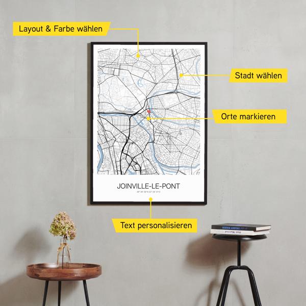 Wähle Farben und Layouts, die perfekt zu dir passen. Ob als klassische Karte in schwarz-weiß oder in modernen Farben. Bei Cartida kannst du ein Design in deinen Lieblingsfarben wählen. Erstelle eine Variante von Joinville-le-Pont, die perfekt zu dir und deiner Wohnung passt.