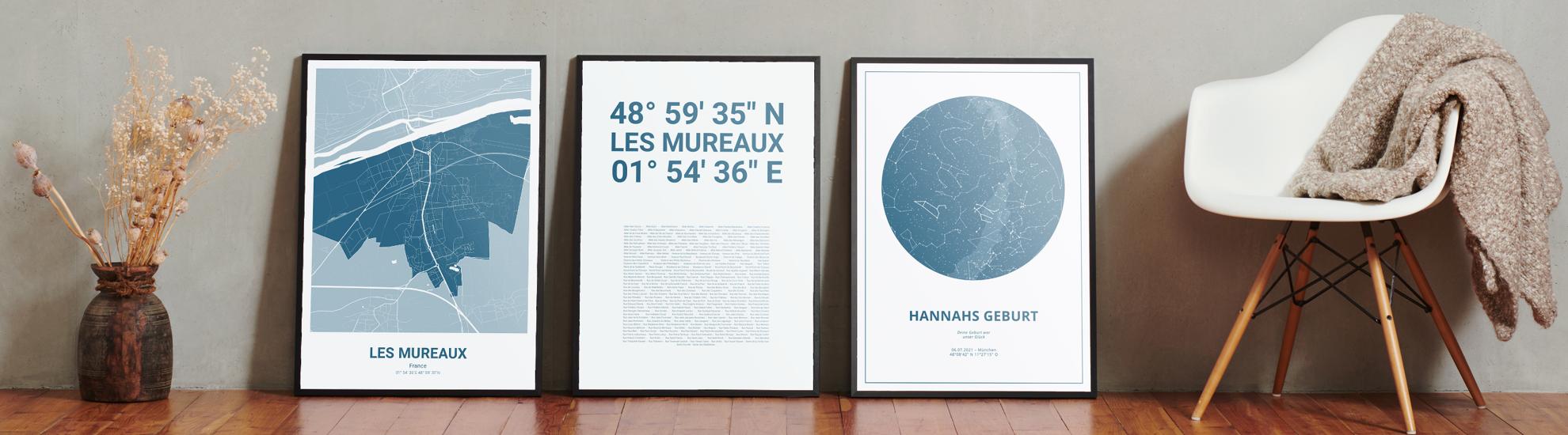 Zahlen, die die Welt bedeuten. Erstelle jetzt dein persönliches Koordinaten-Kunstwerk von deiner Lieblingsstadt. Entscheide selbst, ob Stadtteile, Straßen oder ganz eigene Texte abgedruckt werden. Perfekt als Geschenk zum Einzug oder für die eigenen vier Wände.