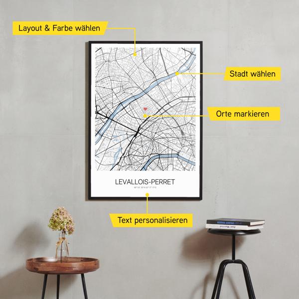 Wähle Farben und Layouts, die perfekt zu dir passen. Ob als klassische Karte in schwarz-weiß oder in modernen Farben. Bei Cartida kannst du ein Design in deinen Lieblingsfarben wählen. Erstelle eine Variante von Levallois-Perret, die perfekt zu dir und deiner Wohnung passt.