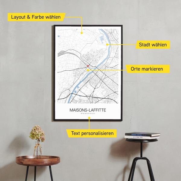 Wähle Farben und Layouts, die perfekt zu dir passen. Ob als klassische Karte in schwarz-weiß oder in modernen Farben. Bei Cartida kannst du ein Design in deinen Lieblingsfarben wählen. Erstelle eine Variante von Maisons-Laffitte, die perfekt zu dir und deiner Wohnung passt.