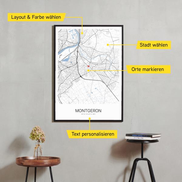 Wähle Farben und Layouts, die perfekt zu dir passen. Ob als klassische Karte in schwarz-weiß oder in modernen Farben. Bei Cartida kannst du ein Design in deinen Lieblingsfarben wählen. Erstelle eine Variante von Montgeron, die perfekt zu dir und deiner Wohnung passt.