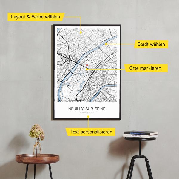 Wähle Farben und Layouts, die perfekt zu dir passen. Ob als klassische Karte in schwarz-weiß oder in modernen Farben. Bei Cartida kannst du ein Design in deinen Lieblingsfarben wählen. Erstelle eine Variante von Neuilly-sur-Seine, die perfekt zu dir und deiner Wohnung passt.