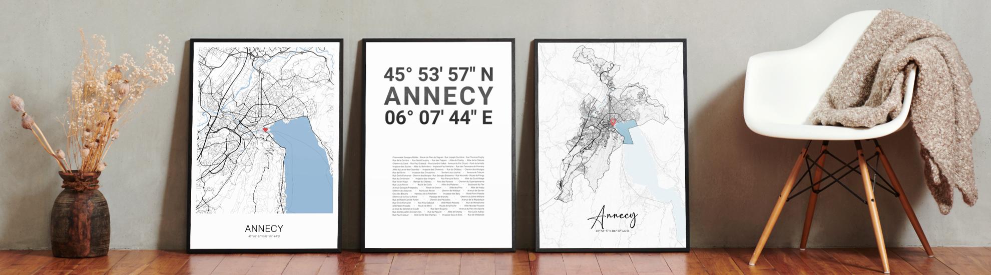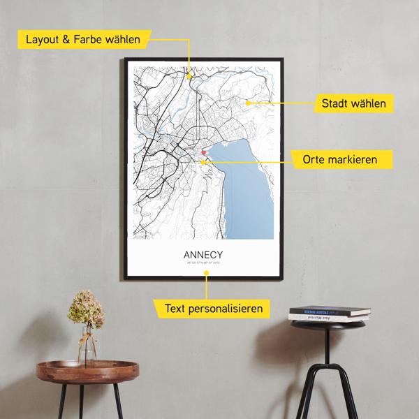 Wähle Farben und Layouts, die perfekt zu dir passen. Ob als klassische Karte in schwarz-weiß oder in modernen Farben. Bei Cartida kannst du ein Design in deinen Lieblingsfarben wählen. Erstelle eine Variante von Annecy, die perfekt zu dir und deiner Wohnung passt.